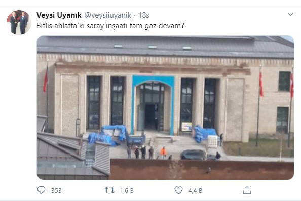 CHP Bitlis İl Başkanı Veysi Uyanık, sosyal medya hesabında yaptığı fotoğraflı paylaşımda, “Bitlis ahlatta’ki saray inşaatı tam gaz devam.” ifadelerini kullandı.