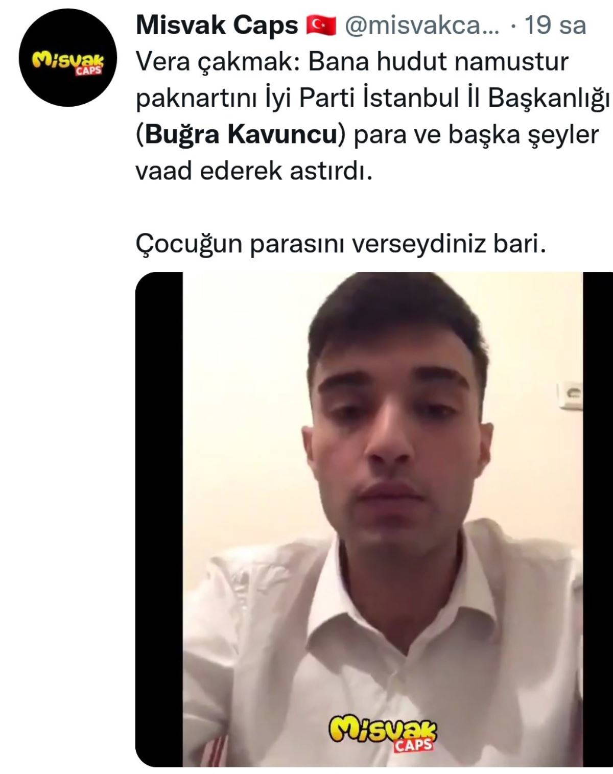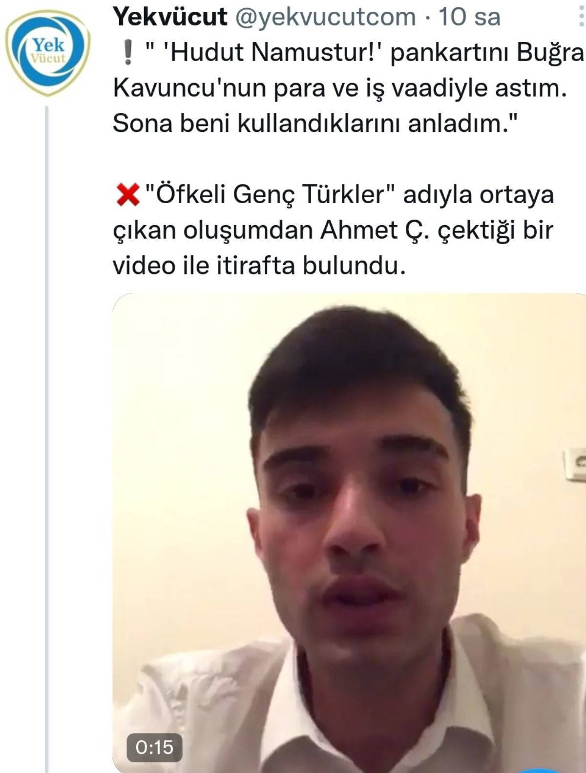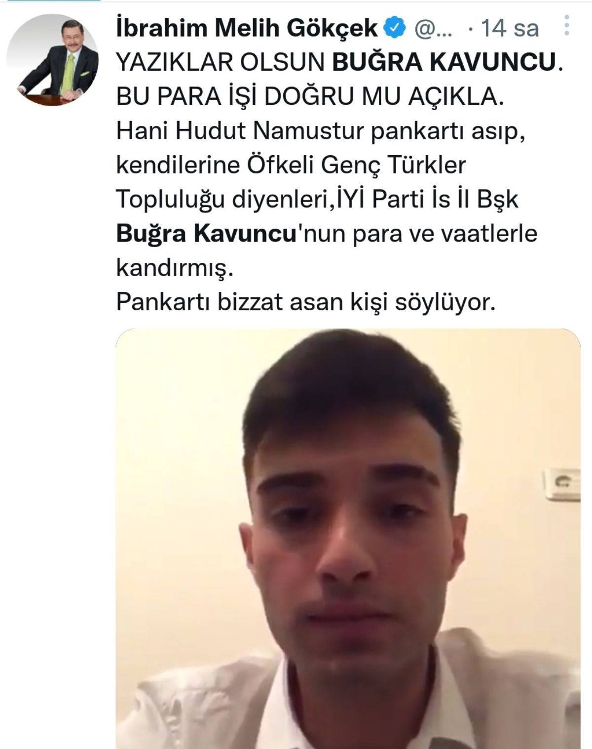 Zorla çekilen videoyu hesabından paylaşan Melih Gökçek, "Yazıklar olsun Buğra Kavuncu. Bu para işi doğru mu, açıkla. 'Hudut namustur' pankartı asıp kendilerine 'Öfkeli Genç Türkler' diyenleri İYİ Parti İstanbul İl Başkanı Buğra Kavuncu'nun para ve vaatlerle kandırmış. Pankartı bizzat asan kişi söylüyor" ifadelerini kullandı.