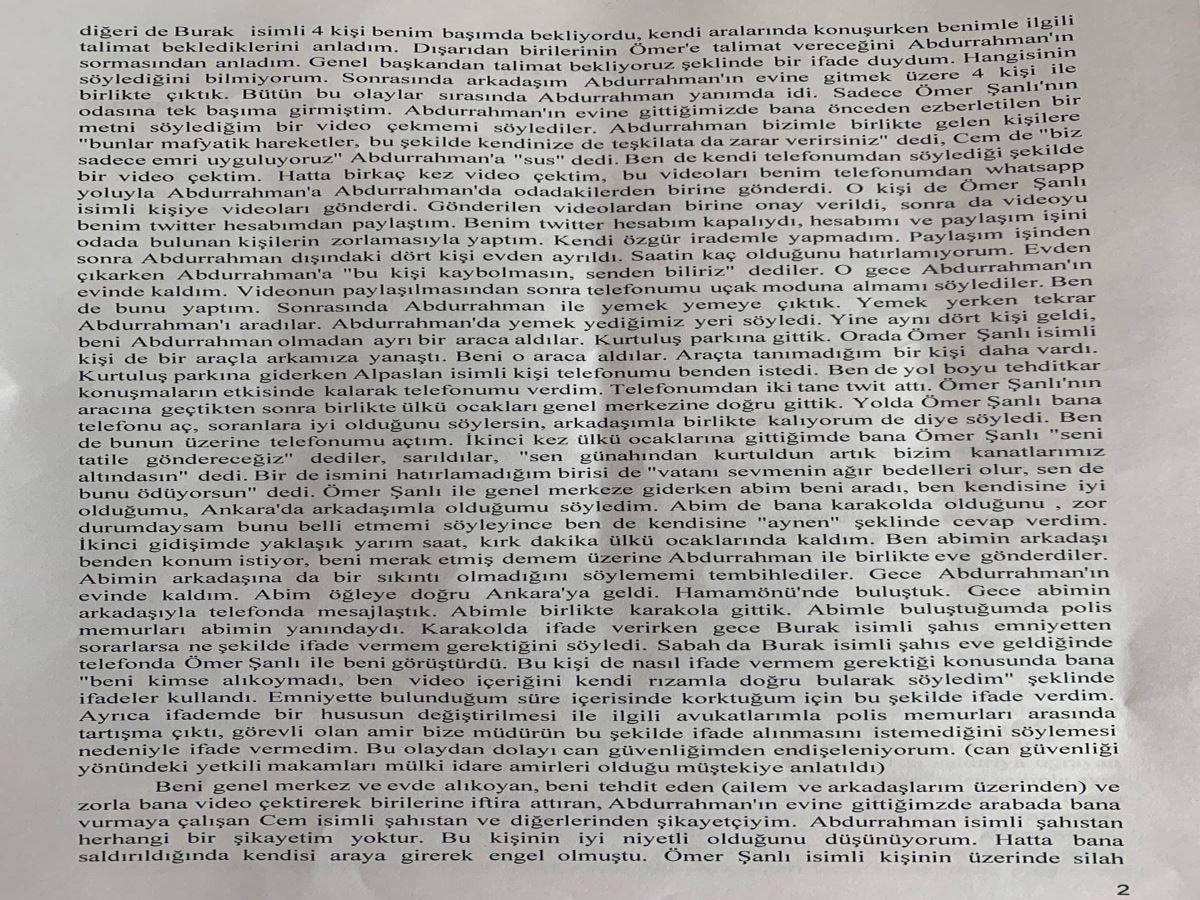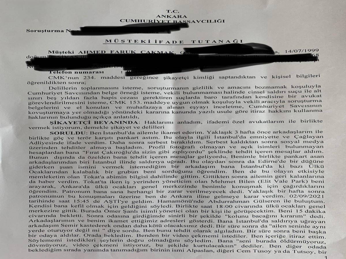 “Hudut namustur” pankartını İYİ Partili Buğra Kavuncu'nun astırdığı yönünde video paylaşan Ahmet Çakmak, poliste verdiği ifadede Ülkü Ocakları Genel Merkezi'nde alıkonulduğunu, kendisini buraya götüren kişinin Selçuk Özdağ'a saldırının faili Abdurrahman Gülseren olduğunu ifade etti.