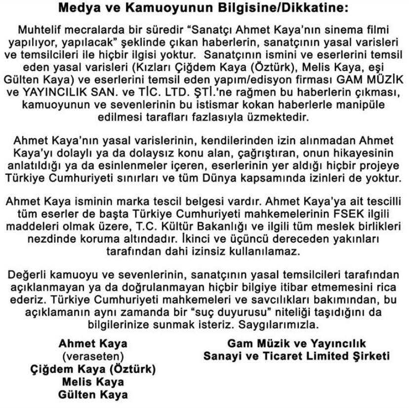 Yapılan açıklamada, "Muhtelif mecralarda bir süredir ‘Sanatçı Ahmet Kaya’nın sinema filmi yapılıyor, yapılacak’ şeklinde çıkan haberlerin, sanatçının yasal varisleri ve temsilcileri ile hiçbir ilgisi yoktur" denirken, "Ahmet Kaya’nın yasal varislerinin, kendilerinden izin alınmadan Ahmet Kaya’yı dolaylı ya da dolaysız konu alan, çağrıştıran, onun hikayesinin anlatıldığı ya da esinlenmeler içeren, eserlerinin yer aldığı hiçbir projeye Türkiye Cumhuriyeti sınırları ve dünya kapsamında izinleri de yoktur" denildi.