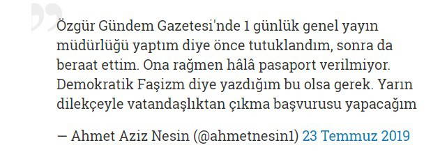 Sosyal medya hesabından yaptığı paylaşımda Nesin, "Özgür Gündem Gazetesi'nde 1 günlük genel yayın müdürlüğü yaptım diye önce tutuklandım, sonra da beraat ettim. Ona rağmen hâlâ pasaport verilmiyor. Demokratik Faşizm diye yazdığım bu olsa gerek. Yarın dilekçeyle vatandaşlıktan çıkma başvurusu yapacağım" ifadesini kullandı.
