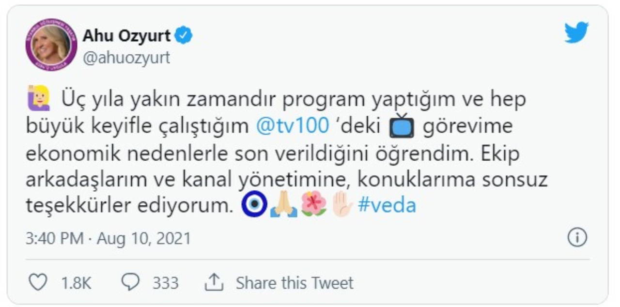 Deneyimli gazeteci Ahu Özyurt, ayrılık haberini Twitter'dan "Üç yıla yakın zamandır program yaptığım ve hep büyük keyifle çalıştığım tv100‘deki görevime ekonomik nedenlerle son verildiğini öğrendim" sözleriyle duyurdu.