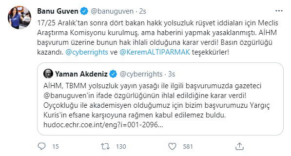 AİHM, Gazeteci Banu Güven, Avukat Yaman Akdeniz ve Kerem Altıparmak'ın ortak başvurusuyla ilgili kararını açıkladı. Türkiye Büyük Millet Meclisi'nin 17-25 Aralık soruşturmasıyla ilgili çalışmalarına getirilen yayın yasağının "ifade özgürlüğü ihlali" olduğuna hükmetti.