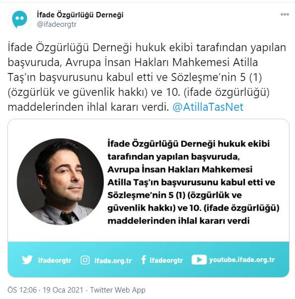 Avrupa İnsan Hakları Mahkemesi (AİHM), şarkıcı Atilla Taş'ın başvurusunda hak ihlali kararı vererek Türkiye'yi mahkum etti. İfade Özgürlüğü Derneği hukuk ekibi tarafından yapılan başvuruda, Avrupa İnsan Hakları Mahkemesi Atilla Taş’ın başvurusunu kabul etti. Karar göre sözleşmenin 5. maddesi olan "özgürlük ve güvenlik" hakkı ile 10. maddesi olan "ifade özgürlüğü" maddeleri ihalal edildi.