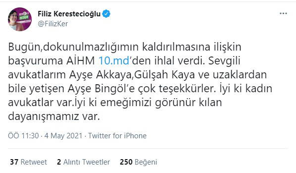 Kerestecioğlu kararla ilgili, “Bugün, dokunulmazlığımın kaldırılmasına ilişkin başvuruma AİHM 10. maddeden ihlal verdi. Sevgili avukatlarım Ayşe Akkaya, Gülşah Kaya ve uzaklardan bile yetişen Ayşe Bingöl’e çok teşekkürler. İyi ki kadın avukatlar var. İyi ki emeğimizi görünür kılan dayanışmamız var” açıklamasını yaptı.