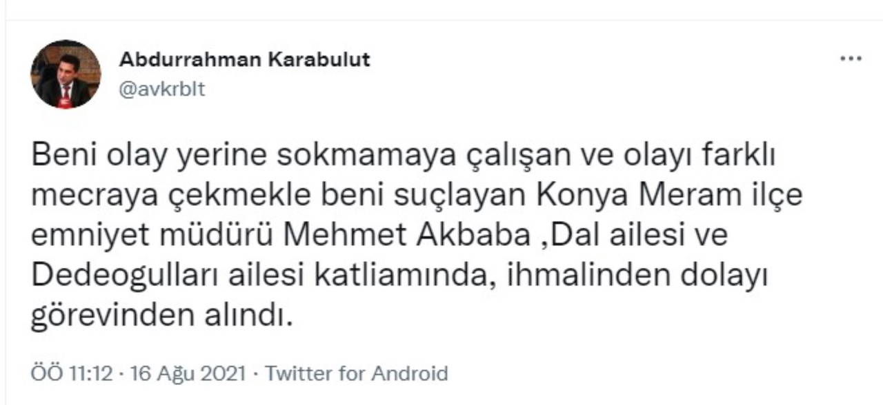 Sosyal medya hesabından açıklama yapan Karabulut, ''Beni olay yerine sokmamaya çalışan ve olayı farklı mecraya çekmekle beni suçlayan Konya Meram ilçe emniyet müdürü Mehmet Akbaba, Dal ailesi ve Dedeogulları ailesi katliamında, ihmalinden dolayı görevinden alındı'' ifadelerini kullandı.