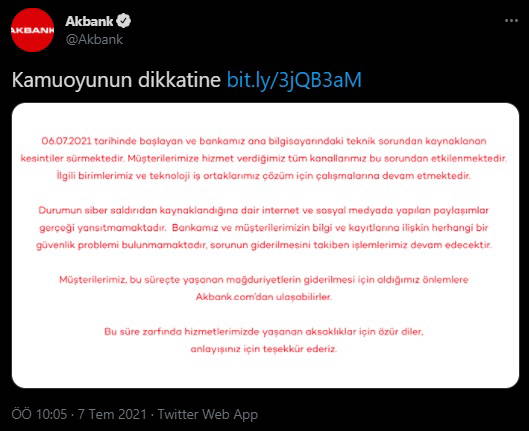 Akbank'tan 'hack' iddialarına ilişkin yapılan açıklamada saldırı iddiaları reddedilmişti.