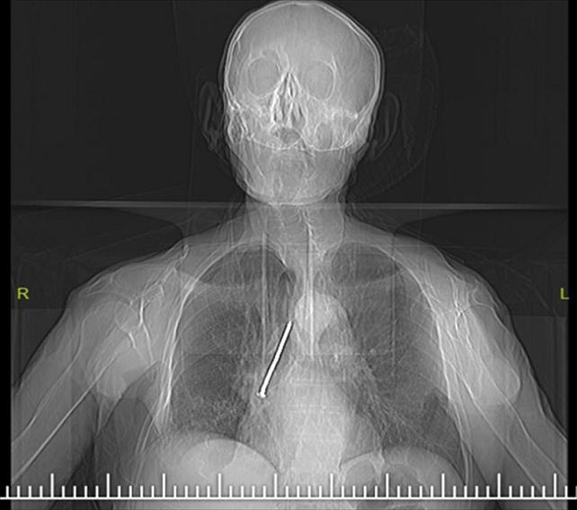 Alınan bilgiye göre, Elazığ Fethi Sekin Şehir Hastanesine öksürük ve nefes darlığı şikayetiyle başvuran 91 yaşındaki Keko Ateş'in röntgen filminde, göğsünde 10 santimetrelik çivi olduğu tespit edildi. Ateş'in soluk borusundan sağ akciğerine kaçmış olan çivi "Rijit bronkoskopi" işlemiyle çıkarıldı.
