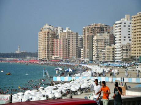 Kıyı şeridindeki yüksek katlı binaların dışı devamlı boyanmasına rağmen kum fırtınaları yüzünden kahverengi ve sarıya dönüyor. Denizin etkisiyle havanın bunaltıcı bir hale geldiği İskenderiye'de halk, biraz da serinlemek için özellikle tatil günleri olan cuma ve cumartesi sahil boyunca dizilen şemsiye ve şezlongların altında dinleniyor veya denize girerek serinliyor.