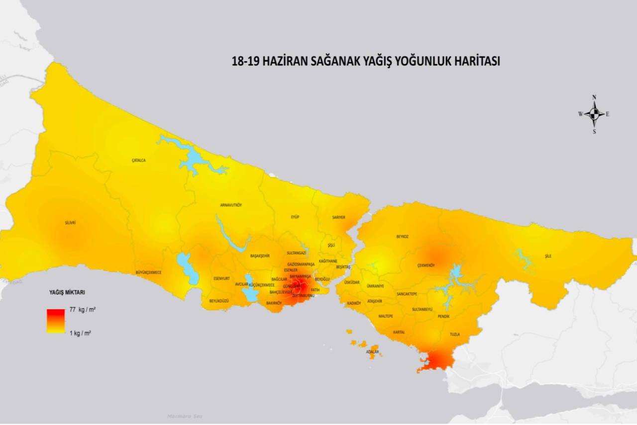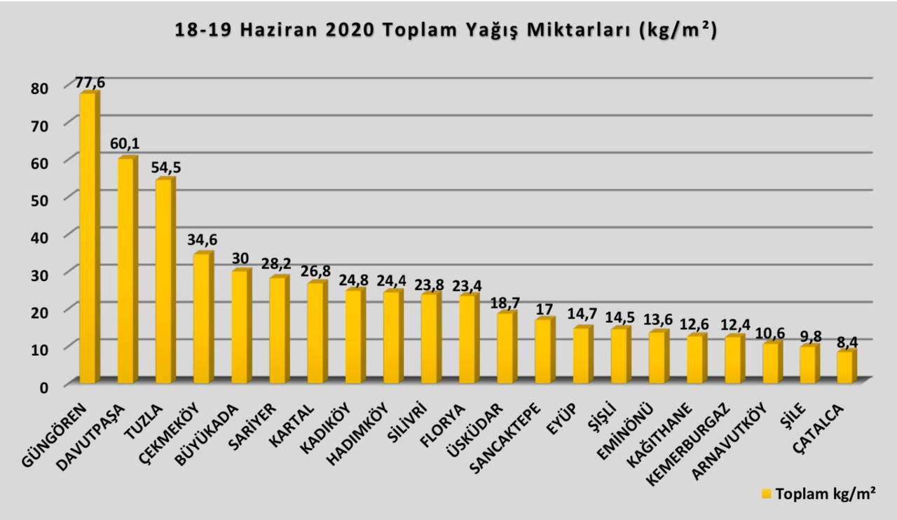 İBB AKOM tarafından hazırlanan ve toplam yağış miktarlarının paylaşıldığı “Kuvvetli Sağanak Yağış Raporu”na göre 18-19 Haziran 2020 tarihlerinde, İstanbul’un güneyinde kalan şehir merkezinin daha çok yağış aldığı görüldü. Avrupa Yakası’nda en fazla yağış Güngören ilçesinde 77 kg/m2, Anadolu Yakası’nda ise Tuzla ilçesinde 54 kg/m2 olarak ölçüldü.