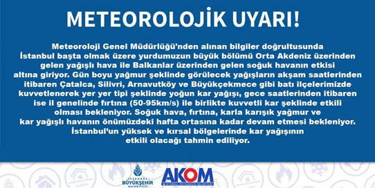 Meteoroloji Genel Müdürlüğü tarafından yapılan son değerlendirmelere göre; Yağışların öğle saatlerinden sonra Kıyı Ege, Çanakkale, Denizli, Antalya, Muğla, Adana'nın Kuzeyi ve Osmaniye çevrelerinde kuvvetli sağanak ve gök gürültülü sağanak, akşam saatlerinden sonra Çanakkale, Tekirdağ çevreleri ile Kırklareli'nin kuzey kesimleri ve İstanbul'un batı kesimlerinde yer yer yoğun kar yağışı şeklinde olacağı tahmin ediliyor. İç ve doğu kesimlerde buzlanma ve don olayı ile birlikte yer yer pus ve sis hadisesi görüleceği tahmin ediliyor.