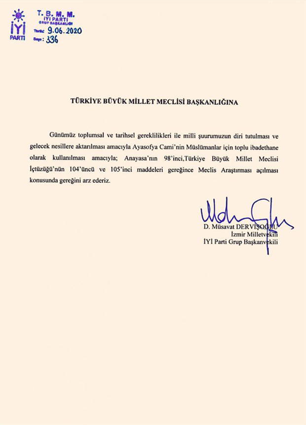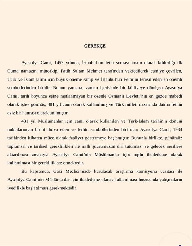 "Günümüz toplumsal ve tarihsel gereklilikleri ile milli şuurumuzun diri tutulması ve gelecek nesillere aktarılması amacıyla Ayasofya Cami'nin Müslümanlar için toplu ibadethane olarak kullanılması amacıyla; Anayasa'nın 98'inci, Türkiye Büyük Millet Meclisi İçtüzüğü'nün 104'üncü ve 105'inci maddeleri gereğince Meclis Araştırması açılması konusunda gereğini arz ederiz."