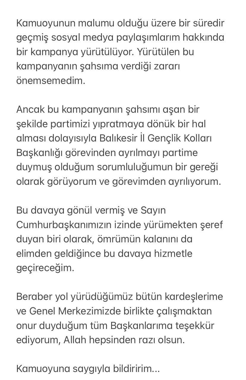 AKP Balıkesir İl Gençlik Kolları Başkanı Mert Nazmi Vizili görevinden istifa etti.