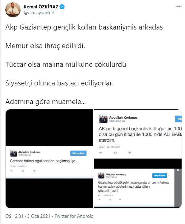 Kemal Özkiraz, AKP Gaziantep İl Gençlik Kolları Başkanı Abdullah Korkmaz'ın geçmiş yıllarda attığı bazı dikkat çekici tweetleri paylaştı.