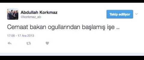 Abdullah Korkmaz, paylaşımlarında FETÖ terör örgütü ile ilgili, ''Cemaat bakan oğullarından başlamış işe'' ifadelerini kullandı.