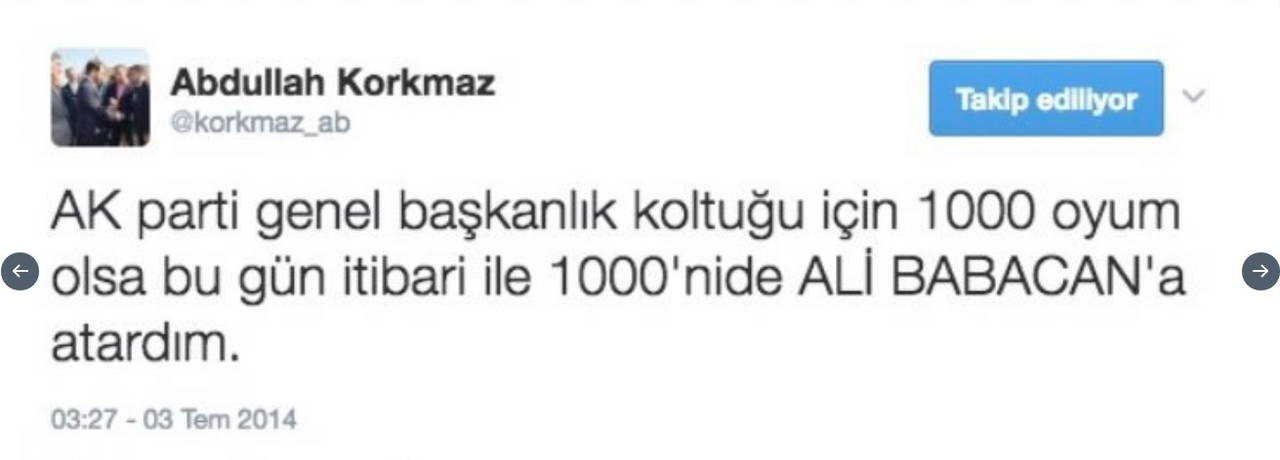 "AK parti başkanlık koltuğu için 1000 oyum olsa bu gün itibari ile 1000'nide Ali Babacan'a atardım" şeklinde paylaşım yaptı. Gaziantep büyükşehir adaylıgında umarım Fatma hanım aday gösterilmez. Hatta lütfen gösterilmesin!''