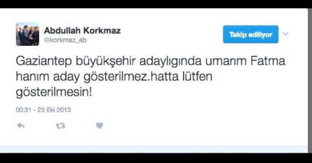 Öte yandan Korkmaz, diğer paylaşımında DEVA Partisi Genel Başkanı Ali Babacan'ı överken, AKP Gaziantep Büyükşehir Belediye Başkanı Fatma Şahin'in aday gösterilmesine karşı çıkarak şu ifadeleri kullandı: