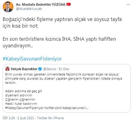 Bayraktar'ın Boğaziçi Üniversitesi'nde Melih Bulu'nun rektörlüğünü protesto edenlere karşı bir grup öğrencinin "fişlendiği" iddiasıyla yaptığı Twitter paylaşımını alıntılayan AKP'li Yüzüak, "Boğaziçi’ndeki fişleme yaptıran alçak ve soysuz tayfa için kısa bir not; En son teröristlere kızınca İHA, SİHA yaptı hafiften uyandırayım.." ifadelerini kullandı.