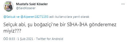 Boğaziçi Üniversitesi öğrencilerine dönük 'SİHA'lı tehdit, Selçuk Bayraktar'a yönelik yapılan bir sosyal medya paylaşımında açık bir isteğe de dönüştü. Paylaşımını yapan ise Hayrat İnsani Derneği Yardım Eskişehir İl Temsilcisi Mustafa Said Köseler oldu. Köseler, Bayraktar'a seslenip "Selçuk abi, şu boğaziçi'ne bir SİHA-İHA gönderemez miyiz???" diye yazdı.