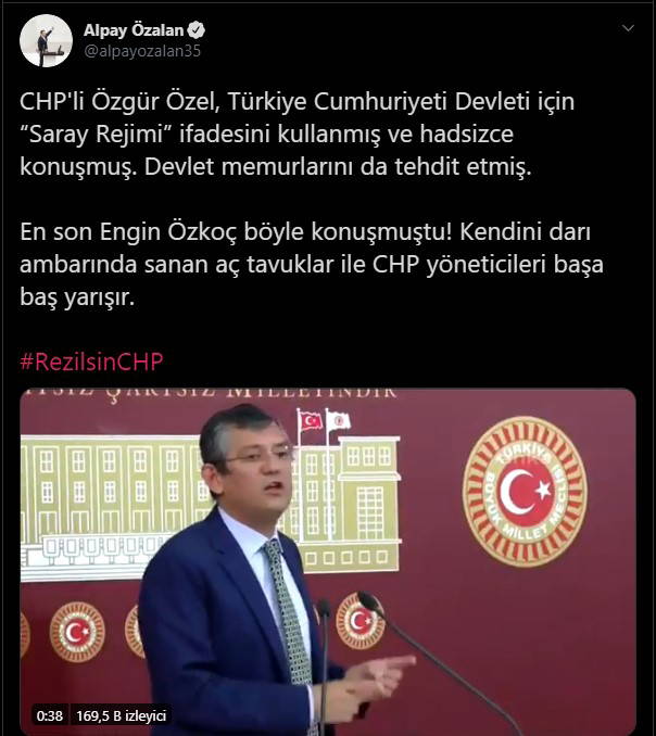 AKP'li Özalan, Twitter adresinden paylaştığı notta, "En son Engin Özkoç böyle konuşmuştu! Kendini darı ambarında sanan aç tavuklar ile CHP yöneticileri başa baş yarışır." ifadeleri yer aldı.