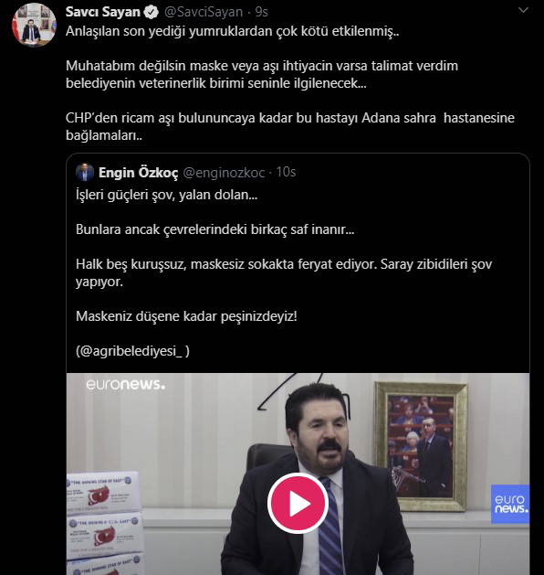 Eleştirileri hazmedemeyen bir diğer isim ise, geçtiğimiz günlerde ABD'li ünlülere maske göndererek gündeme gelen Ağrı Belediyesi'nin AKP'li Başkanı Savcı Sayan oldu. Savcı Sayan, ABD'li ünlülere maske göndermesini eleştiren CHP Milletvekili Engin Özkoç'u mecliste uğradığı saldırı üzerinden hedef aldı.