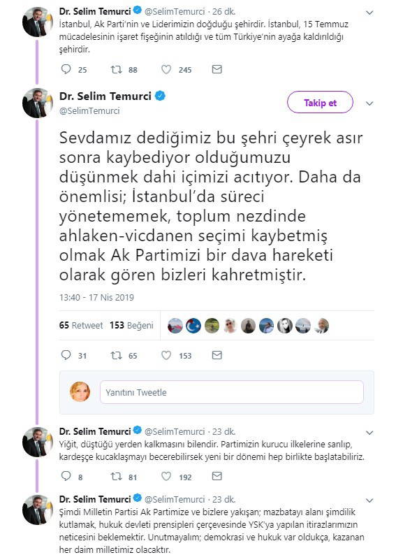 Sevdamız dediğimiz bu şehri çeyrek asır sonra kaybediyor olduğumuzu düşünmek dahi içimizi acıtıyor. Daha da önemlisi; İstanbul’da süreci yönetememek, toplum nezdinde ahlaken-vicdanen seçimi kaybetmiş olmak Ak Partimizi bir dava hareketi olarak gören bizleri kahretmiştir. Yiğit, düştüğü yerden kalkmasını bilendir. Partimizin kurucu ilkelerine sarılıp, kardeşçe kucaklaşmayı becerebilirsek yeni bir dönemi hep birlikte başlatabiliriz. Şimdi Milletin Partisi Ak Partimize ve bizlere yakışan; mazbatayı alanı şimdilik kutlamak, hukuk devleti prensipleri çerçevesinde YSK’ya yapılan itirazlarımızın neticesini beklemektir. Unutmayalım; demokrasi ve hukuk var oldukça, kazanan her daim milletimiz olacaktır.