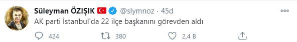 İktidara yakınlığıyla tanınan Türkiye gazetesi yazarı Süleyman Özışık Twitter hesabı üzerinden paylaşım yaparak AKP’nin İstanbul’da 22 ilçe başkanını görevden aldığını duyurdu.