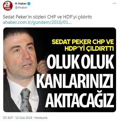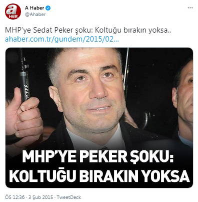 Sedat Peker'in bugün 'Pelikan' yapılanmasıyla bağlantılı gösterdiği, Berat Albayrak'ın kardeşi Serhat Albayrak'a ait Turkuvaz Grubu bünyesindeki A Haber, Peker'in o dönem Cumhur ittifakı dışında olan MHP'yi başkanlık sistemi üzerinden eleştirdiği ve muhalefete yönelik ölüm tehditi içerikli konuşmalarını manşetlere taşıyordu.