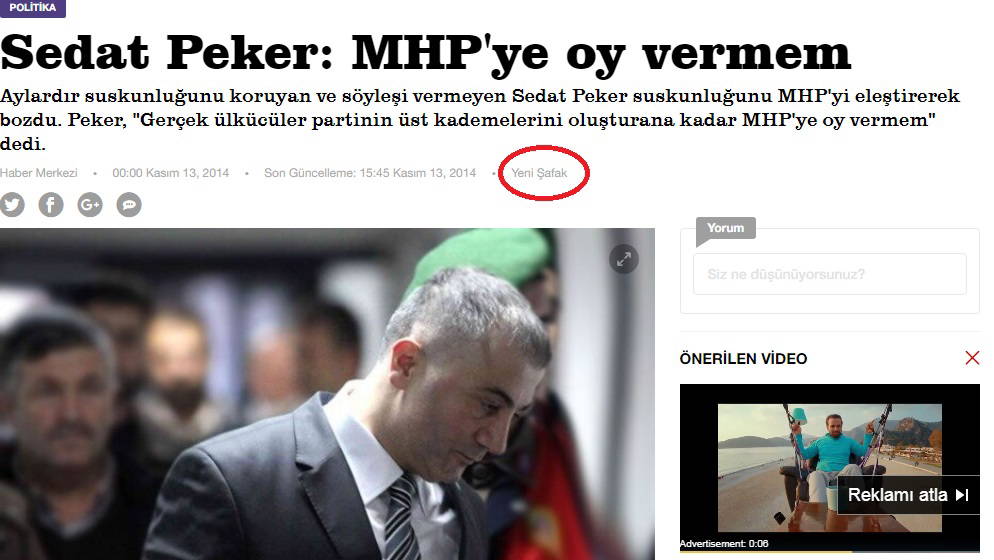 AKP'ye yakın Yeni Şafak grubu da Peker'in AKP'yle geçmişte ittifak halinde olmayan MHP'yi eleştiren sözlerini haberleştirmişti. Haberde Peker'in "Gerçek ülkücüler partinin üst kademelerini oluşturana kadar MHP''ye oy vermem" dediği sözlerine yer verilmişti.