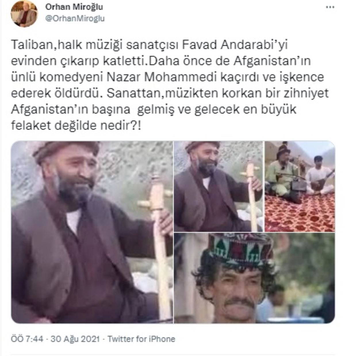 AKP MKYK Üyesi Orhan Miroğlu, Taliban'ın halk müziği sanatçısı Favad Andarabi’yi evinden çıkarıp katletmesi üzerine Taliban için Twitter üzerinden "Afganistan’ın başına gelmiş ve gelecek en büyük felaket" diye tepki gösterdi.