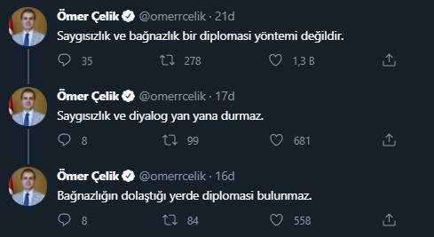 AKP'li Çelik, Twitter hesabından yaptığı açıklamada, "Saygısızlık ve bağnazlık bir diplomasi yöntemi değildir. Saygısızlık ve diyalog yan yana durmaz. Bağnazlığın dolaştığı yerde diplomasi bulunmaz" ifadelerini kullandı.