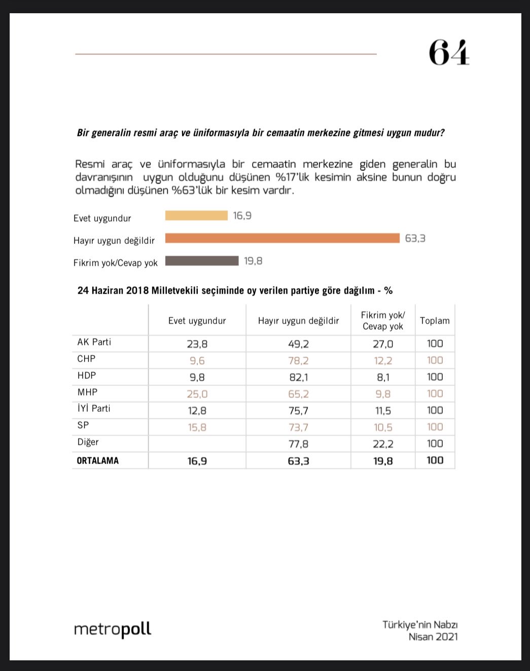 Ankete göre, "Bir generalin resmi araç ve üniformasıyla bir cemaatin merkezine gitmesi uygun mudur?" sorusuna "evet" yanıtı verenlerin yüzde 16.9'da kalırken, "hayır" yüzde 63.3 oldu. Kararsızların oranı ise yüzde 19.8 oldu.