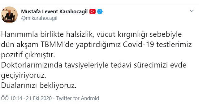 "Hanımımla birlikte halsizlik, vücut kırgınlığı sebebiyle dün akşam TBMM'de yaptırdığımız Covid-19 testlerimiz pozitif çıkmıştır. Doktorlarımızında tavsiyeleriyle tedavi sürecimizi evde geçiyiriyoruz. Dualarınızı bekliyoruz."