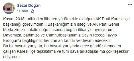 “Kasım 2018 tarihinden itibaren yürütmekte olduğum AK Parti Karesi İlçe Başkanlığı görevimden İl Başkanlığımızın isteği ve AK Parti Genel Merkezimizin takdiri doğrultusunda bugün itibarıyla ayrılıyorum”