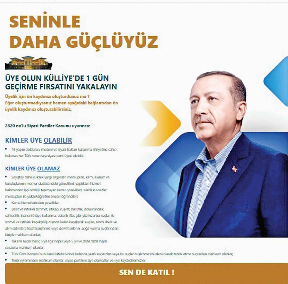 Rize Çayeli’nde AKP İlçe Başkanlığı, üye sayısını artırmak için kampanya başlattı. AKP’li teşkilat, yerel basına verilen ilanlarda yurttaşlara, “Üye olun külliyede 1 gün geçirme fırsatını yakalayın” diye seslendi.