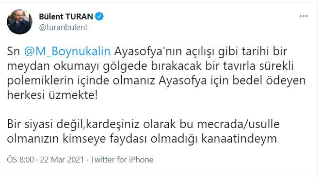 AKP Grup Başkanvekili Bülent Turan, ''Sn. Mehmet Boynukalın Ayasofya'nın açılışı gibi tarihi bir meydan okumayı gölgede bırakacak bir tavırla sürekli polemiklerin içinde olmanız Ayasofya için bedel ödeyen herkesi üzmekte! Bir siyasi değil,kardeşiniz olarak bu mecrada/usulle olmanızın kimseye faydası olmadığı kanaatindeyim'' ifadelerini kullandı.