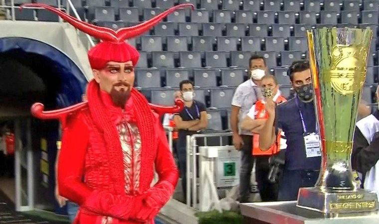 Fenerbahçe’ye kupasını kırmızı makyajlı ve kırmızı elbiseli, boynuzlu kostüm giymiş bir görevli teslim etti.
