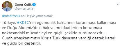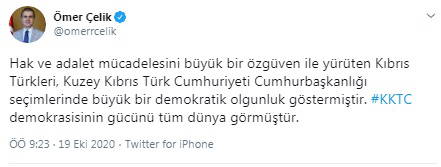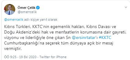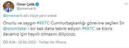 Çelik, seçim sonuçları için Twitter aracılığıyla yaptığı değerlendirme açıklamasında "Kıbrıs Türkleri, KKTC’nin egemenlik hakları, Kıbrıs Davası ve Doğu Akdeniz’deki hak ve menfaatlerin korumasına dair gayreti, vizyonu ve liderliğiyle öne çıkan Sn @ersinrtatar’ı #KKTC Cumhurbaşkanlığı’na seçerek tüm dünyaya açık bir mesaj vermiştir." dedi.