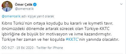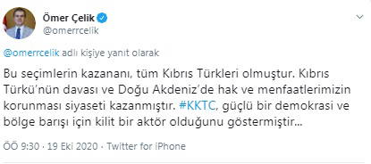 KKTC’de Cumhurbaşkanlığı seçimini yüzde 51,74 oyla Ersin Tatar kazandı. Sonucun açıklanmasının ardından AKP Sözcüsü Ömer Çelik bir açıklama yaptı.