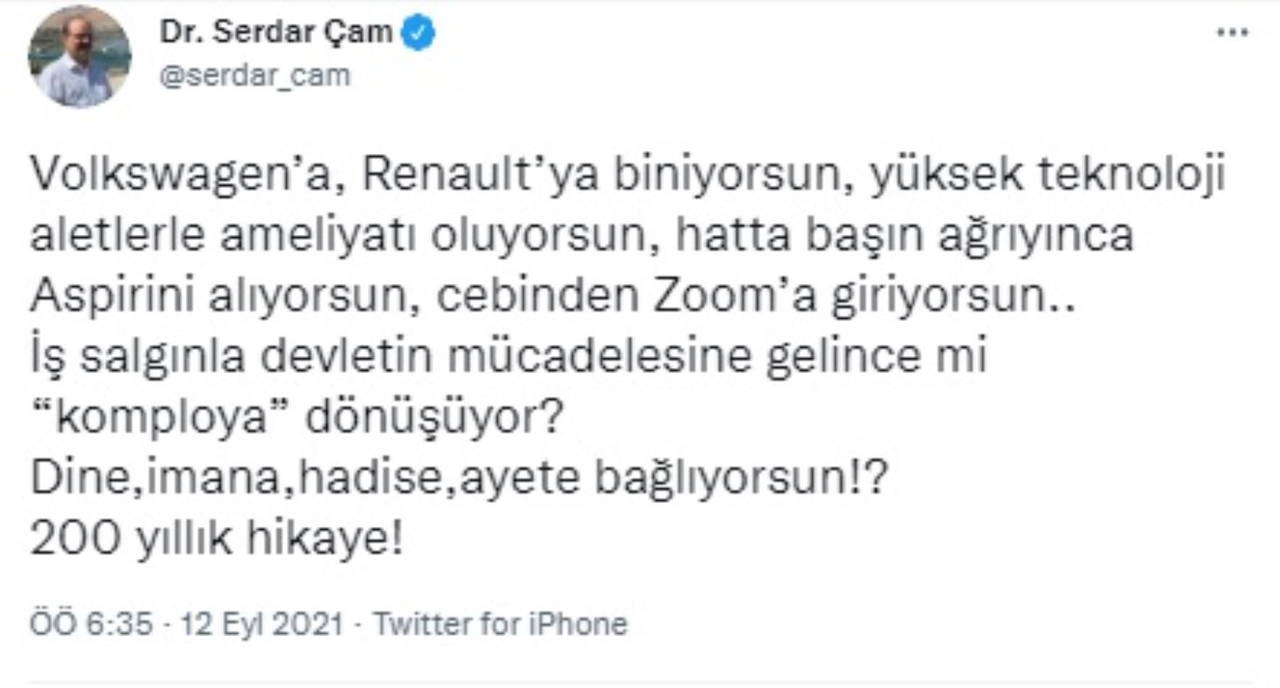 Kültür ve Turizm Bakan Yardımcısı Serdar Çam, aşının "komplo" olduğunu öne sürenlere yönelik sosyal medya hesabından yaptığı paylaşımda şu ifadeleri kullandı: