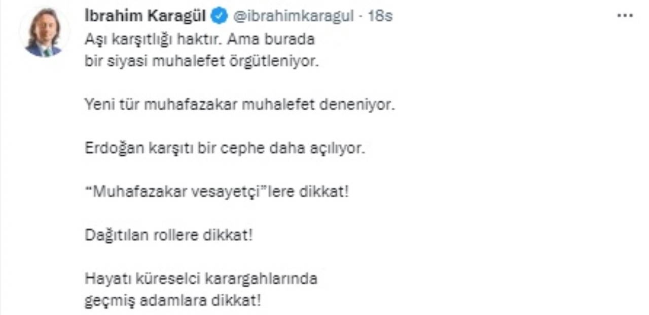Yeni Şafak yazarı İbrahim Karagül de konuyla ilgili "muhafakazar muhalefet" ve "küreselci karargahlar" iddiasında bulunarak "Aşı karşıtlığı haktır. Ama burada bir siyasi muhalefet örgütleniyor. Yeni tür muhafazakar muhalefet deneniyor. Erdoğan karşıtı bir cephe daha açılıyor. “Muhafazakar vesayetçi”lere dikkat! Dağıtılan rollere dikkat! Hayatı küreselci karargahlarında geçmiş adamlara dikkat!" ifadelerini kullandı.