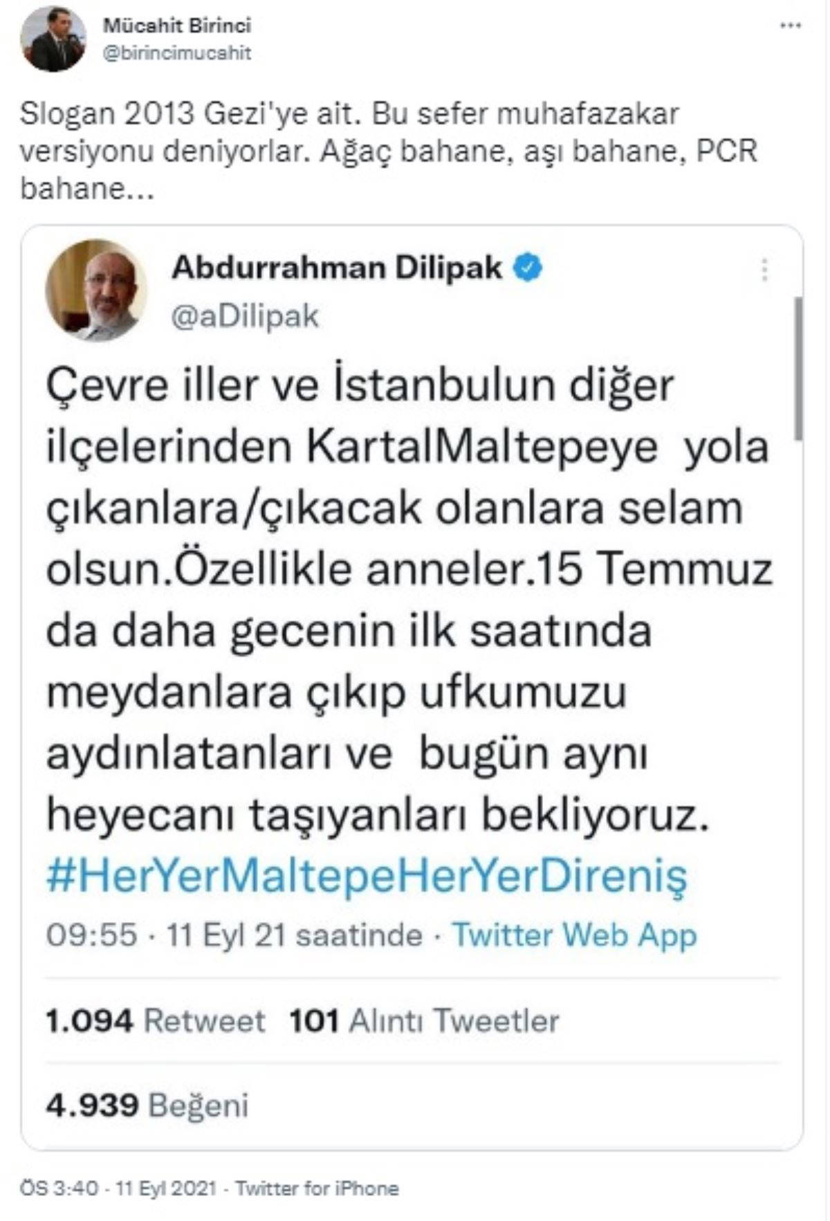 AKP MKYK Üyesi Mücahit Birinci ise Maltepe'deki mitingin konuşmacısı olan Yeni Akit yazarı Abdurrahman Dilipak'ın mitinge çağrı paylaşımındaki "HerYerMaltepeHerYerDireniş" sloganına işaret edip konuyu Gezi Direnişi'yle ilişkilendirdi. "Slogan 2013 Gezi'ye ait" diyen Birinci "Bu sefer muhafazakar versiyonu deniyorlar. Ağaç bahane, aşı bahane, PCR bahane..." diye yazdı.