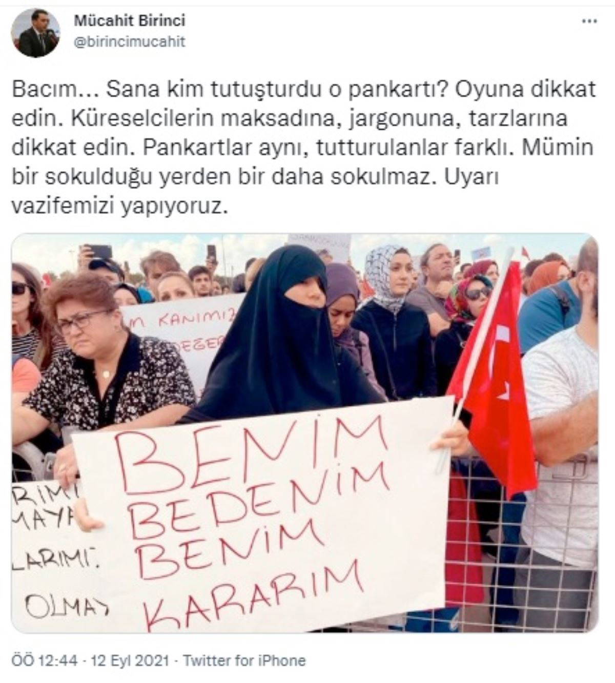 AKP'li Birinci, mitingle ilgili bir başka paylaşımında da, üzerinde "Benim bedenim benim kararım" yazılı bir dövizi elinde tutan kadına yönelik "Bacım... Sana kim tutuşturdu o pankartı? Oyuna dikkat edin. Küreselcilerin maksadına, jargonuna, tarzlarına dikkat edin. Pankartlar aynı, tutturulanlar farklı. Mümin bir sokulduğu yerden bir daha sokulmaz. Uyarı vazifemizi yapıyoruz." diye yazdı.
