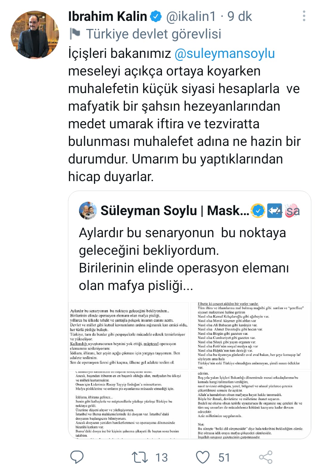 ''İçişleri bakanımız @suleymansoylu meseleyi açıkça ortaya koyarken muhalefetin küçük siyasi hesaplarla ve mafyatik bir şahsın hezeyanlarından medet umarak iftira ve tezviratta bulunması muhalefet adına ne hazin bir durumdur. Umarım bu yaptıklarından hicap duyarlar'' ifadelerini kullandı.