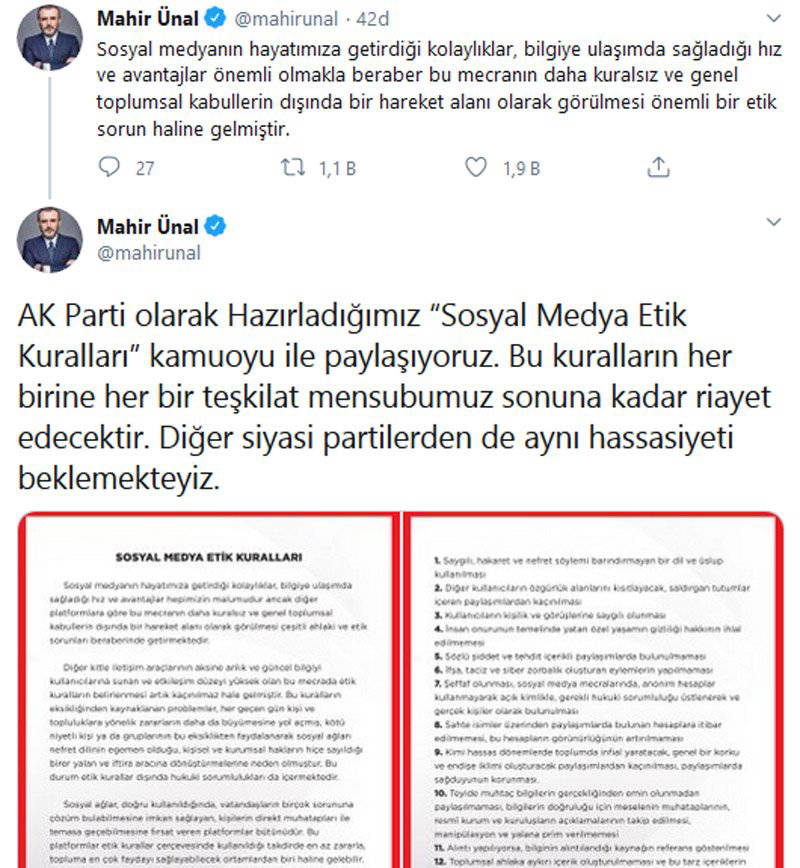 AKP Genel Başkan Yardımcısı Mahir Ünal, AKP Genel Merkezi tarafından hazırlanan “Sosyal Medya Etik Kuralları”nı kamuoyu ile sosyal medya hesabından paylaştı. Ünal, bu kuralların her birine her bir AKP teşkilat mensubunun sonuna kadar riayet edeceğini, diğer siyasi partilerden de aynı hassasiyeti beklediklerini belirtti.