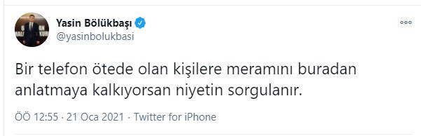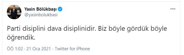 Soylu'nun bu yöndeki açıklamalarının hemen ardından bir açıklamanın AKP Genel Sekreter Yardımcısı Yasin Bölükbaşı'ndan geldi. Bölükbaşı, "Bir telefon ötede olan kişilere meramını buradan anlatmaya kalkıyorsan niyetin sorgulanır. Parti disiplini dava disiplinidir. Biz böyle gördük böyle öğrendik" dedi.