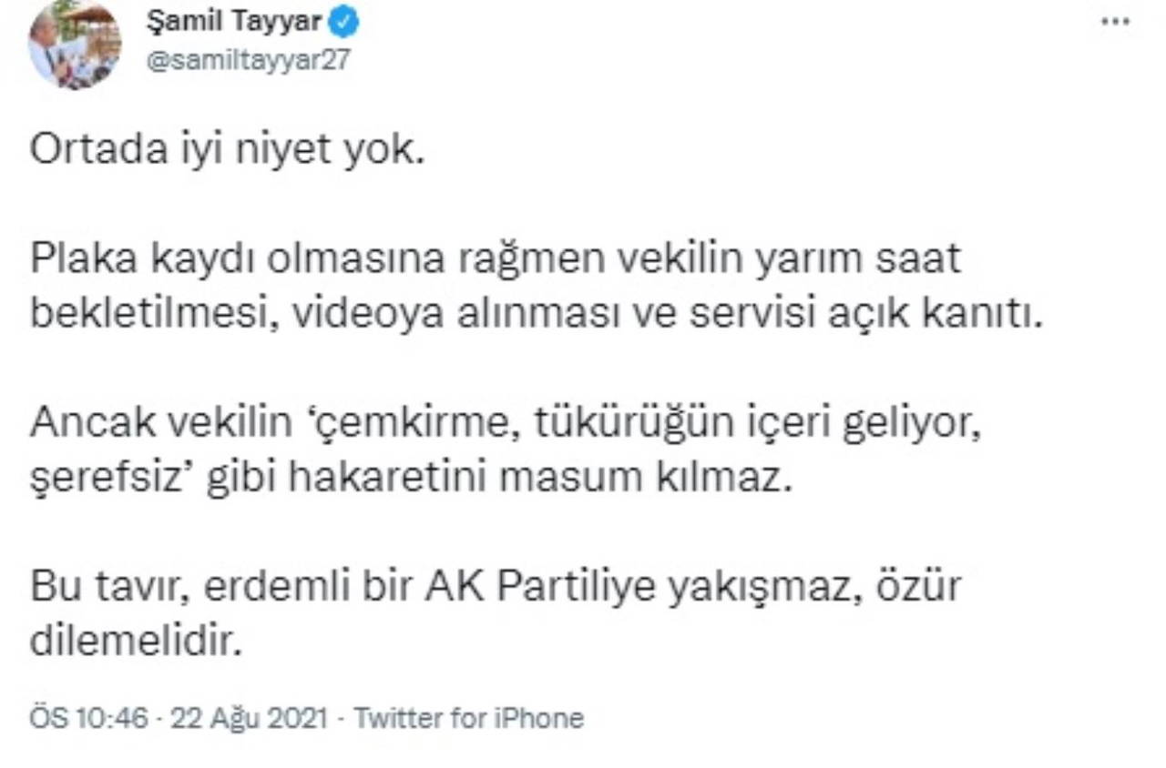 Tepki çeken olaya ilişkin, “Ortada iyi niyet yok. Plaka kaydı olmasına rağmen vekilin yarım saat bekletilmesi, videoya alınması ve servisi açık kanıtı” yorumu yapan Tayyar, “Ancak vekilin ‘çemkirme, tükürüğün içeri geliyor, şerefsiz' gibi hakaretini masum kılmaz. Bu tavır, erdemli bir AK Partiliye yakışmaz" ifadeleriyle eleştirdiği Zeynep Gül Yılmaz'ı özür dilemeye çağırdı.