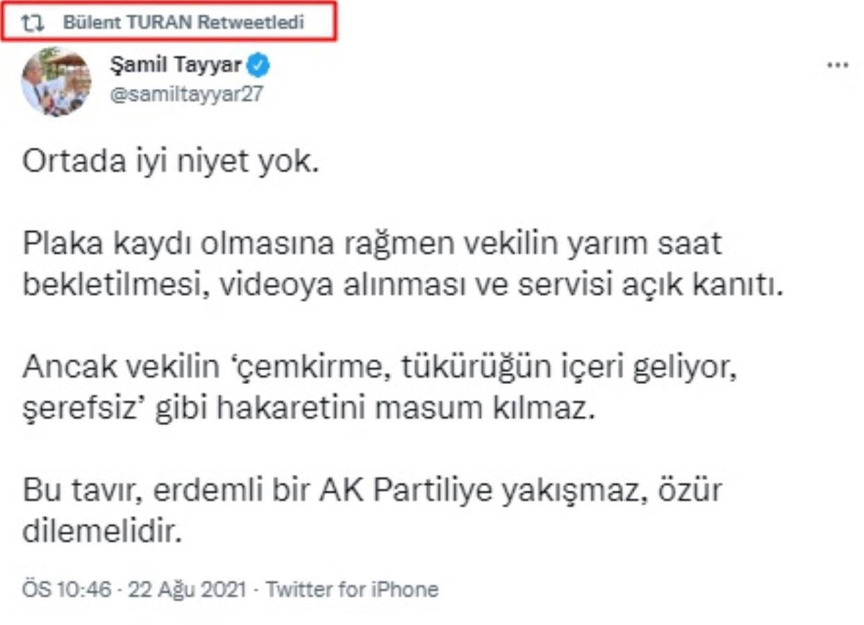 AKP Grup Başkanvekili Bülent Turan da Şamil Tayyar’ın sosyal medyadan yaptığı bu açıklamasına yeniden paylaşım (RT) yaparak destek verdi.