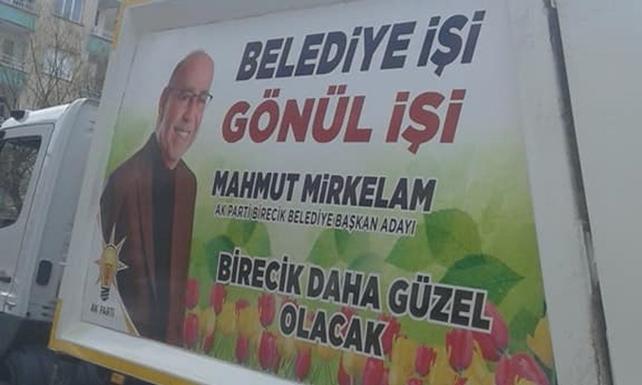Birecik İlçe Belediyesi'nin AKP’li belediye başkanı Faruk Pınarbaşı, yeniden aday gösterilmese de yerine aday gösterilen aynı zamanda kaynı olan işadamı Mahmut Mirkelam’ın isminin resmi araçların üstüne yazılması, araçlarda parti sloganı ve renklerinin yer alması ilçede muhalefet adaylarının tepkisine yol açtı.