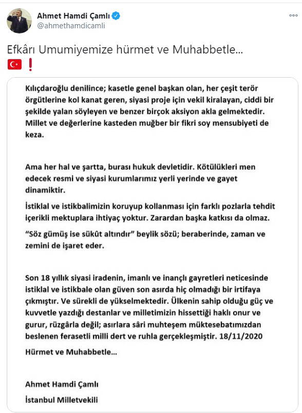 'Yeliz' rumuzuyla açtığı sahte hesapla bilinen AKP İstanbul Milletvekili Ahmet Hamdi Çamlı, suç örgütü lideri Alaattin Çakıcı'nın Kılıçdaroğlu'nu tehdit etmesi hakkında yorumda bulundu. Twitter hesabından bir açıklama metni yayınlayan Çamlı, Kılıçdaroğlu'nu eleştiren ve hedef gösteren ifadelerle başladığı metne "Ama her hal ve şartta burası bir hukuk devleti" diyerek devam etti.